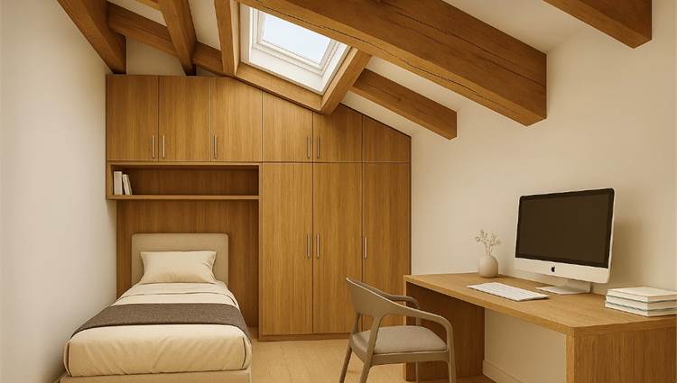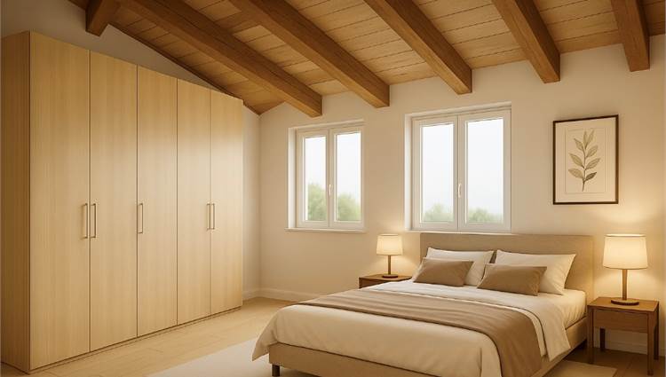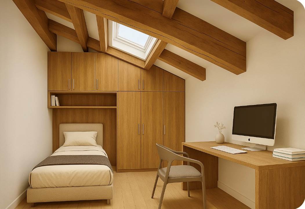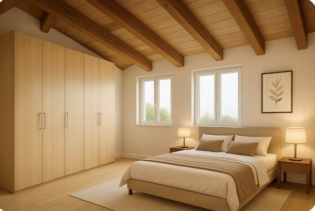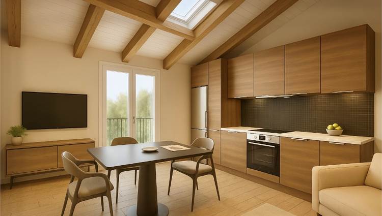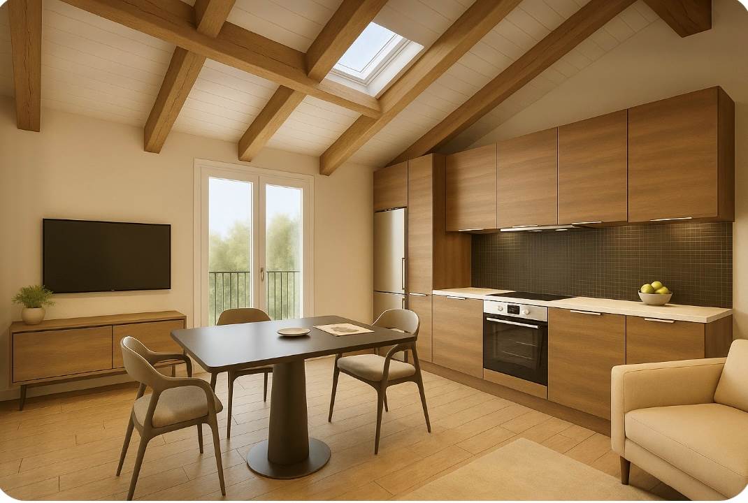 Unità 6- MANSARDA CON TRAVI IN LEGNO A VISTA: Composto da sala con angolo cottura di 25 mq, 2 camere, bagno, lavanderia, balcone con affaccio a sud ( e vista sulla piacevole corte interna) ed ampia cantina.