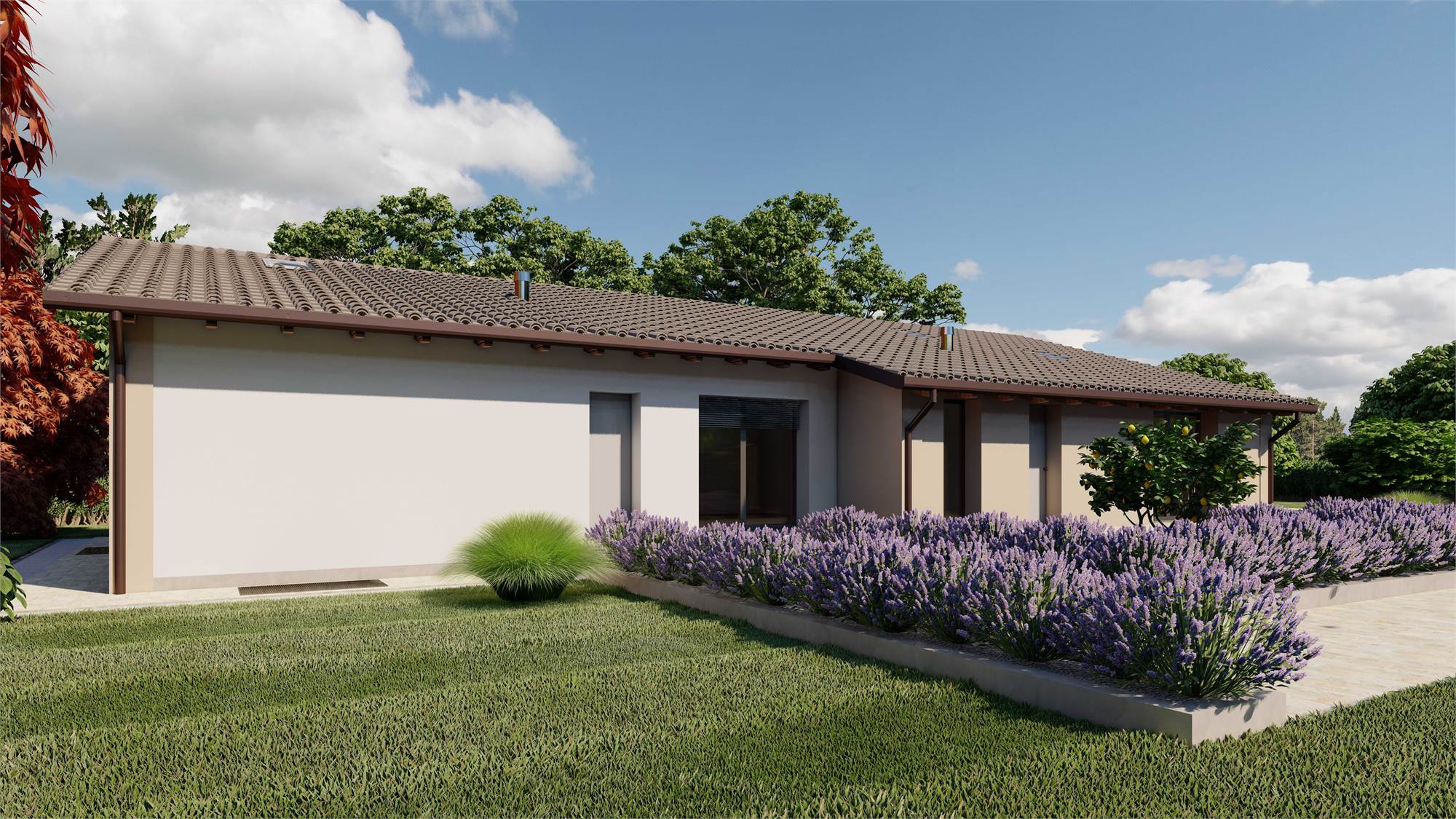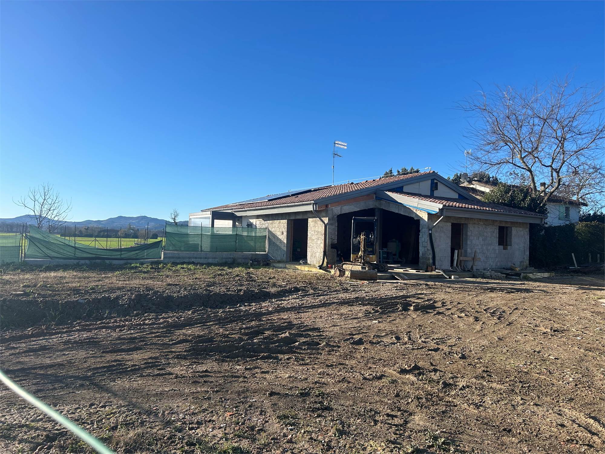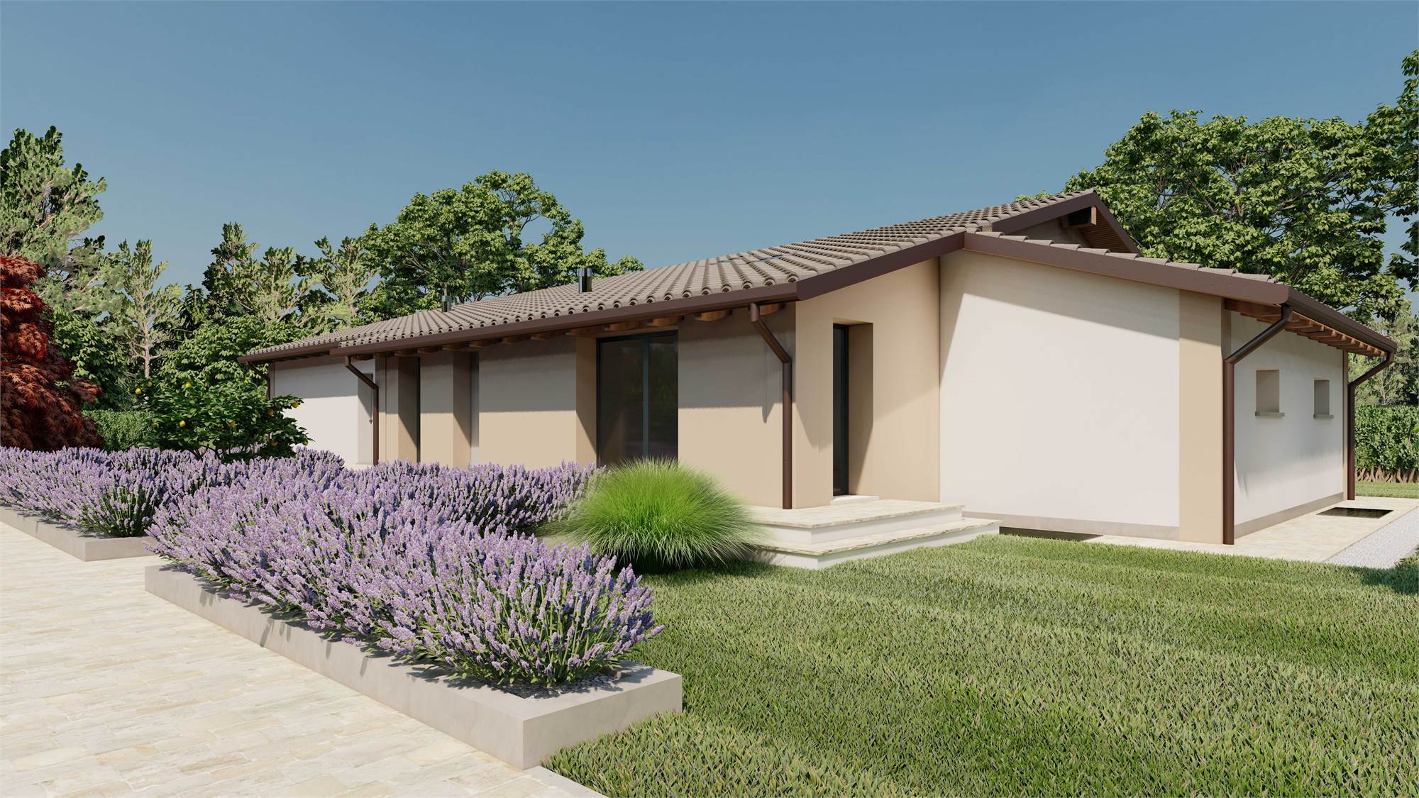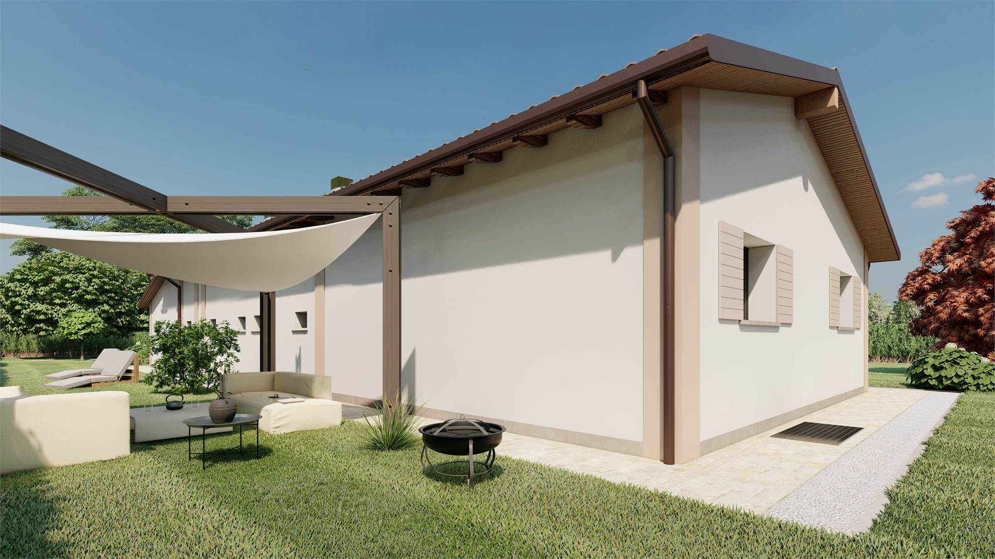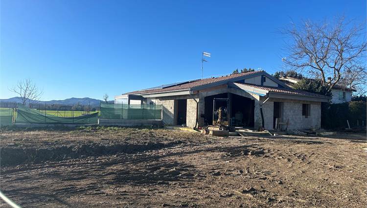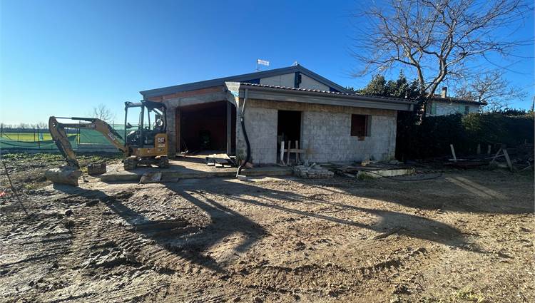 La villetta, attualmente allo stato grezzo, viene venduta completamente finita ed è composta da ampia zona giorno living di salotto con cucina a vista di 46 mq calpestabili, due camere da letto, 2 bagni, ripostiglio, vano tecnico con alloggiamento impianti, autorimessa di 34 mq e giardino privato di circa 600 mq. Completa la proprietà un fabbricato accessorio di circa 46 mq interamente disposto al piano terra che verrà venduto completamente finito esternamente ed allo stato grezzo interno.