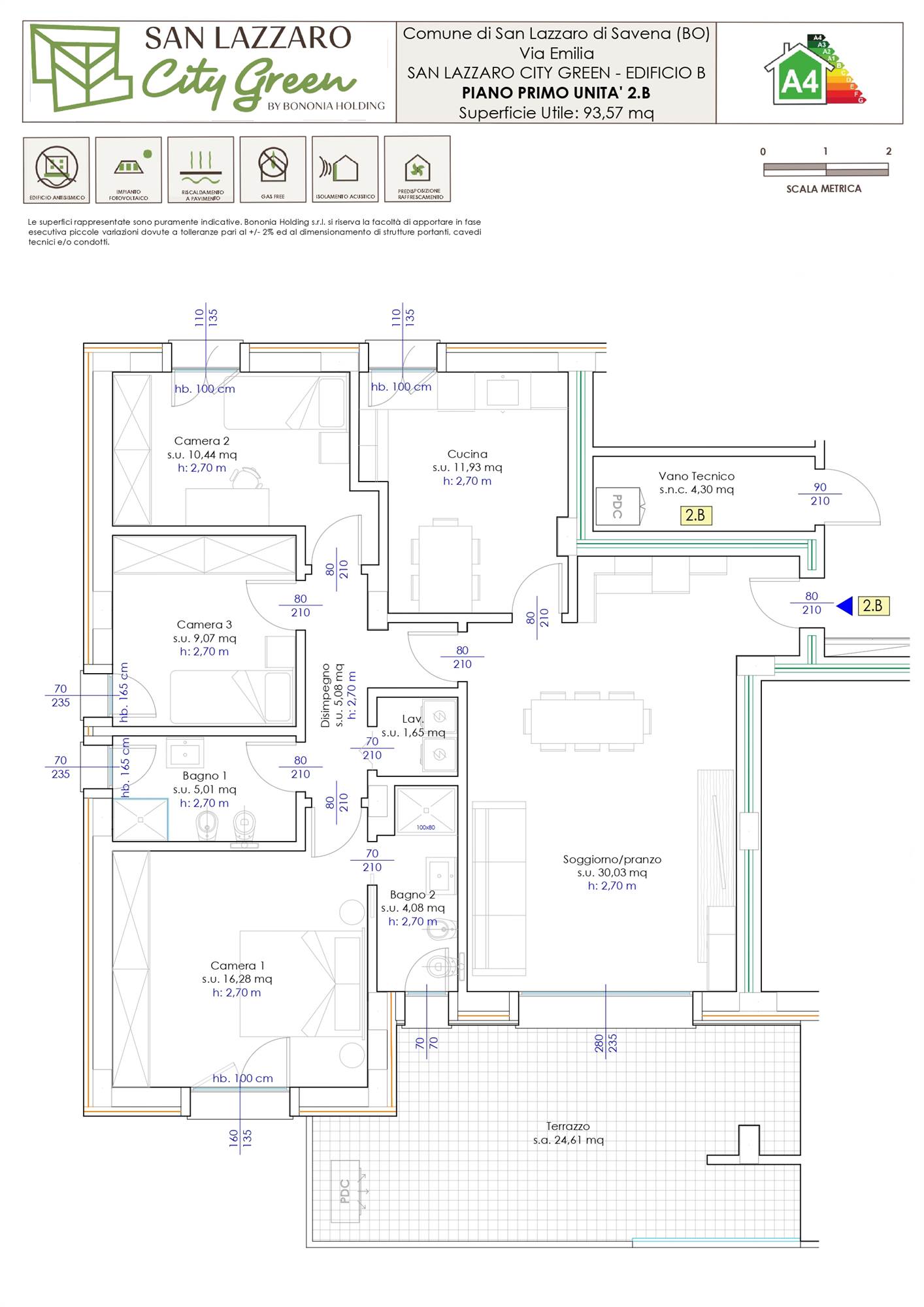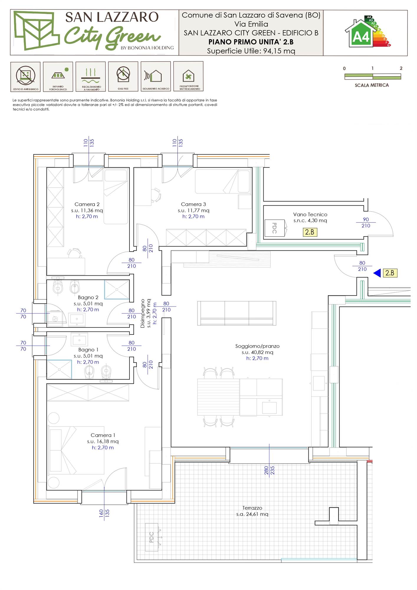 Classe energetica A2/A4, termocappotto esterno, impianto fotovoltaico privato, riscaldamento a pavimento, tapparelle motorizzate con alette regolabili, predisposizione per impianto di allarme, pavimenti in gres porcellanato con effetti moderni o effetti pietra, infissi in pvc bianco.