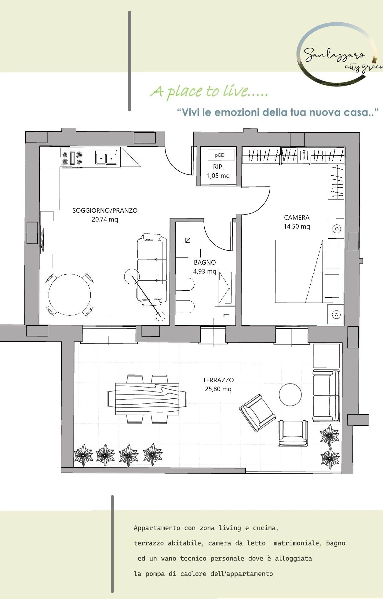 “San Lazzaro City Green” sarà costituito da 8 piccole palazzine, realizzate in classe energetica dalla A2 alla A4, ogni unità sarà autonoma nei consumi impianto fotovoltaico privato a beneficio esclusivo dell’immobile, predisposizione impianto aria condizionata, riscaldamento a pavimento, tapparelle motorizzate, cappotto esterno, ampie terrazze utilizzabili come zone living in aggiunta al salotto.