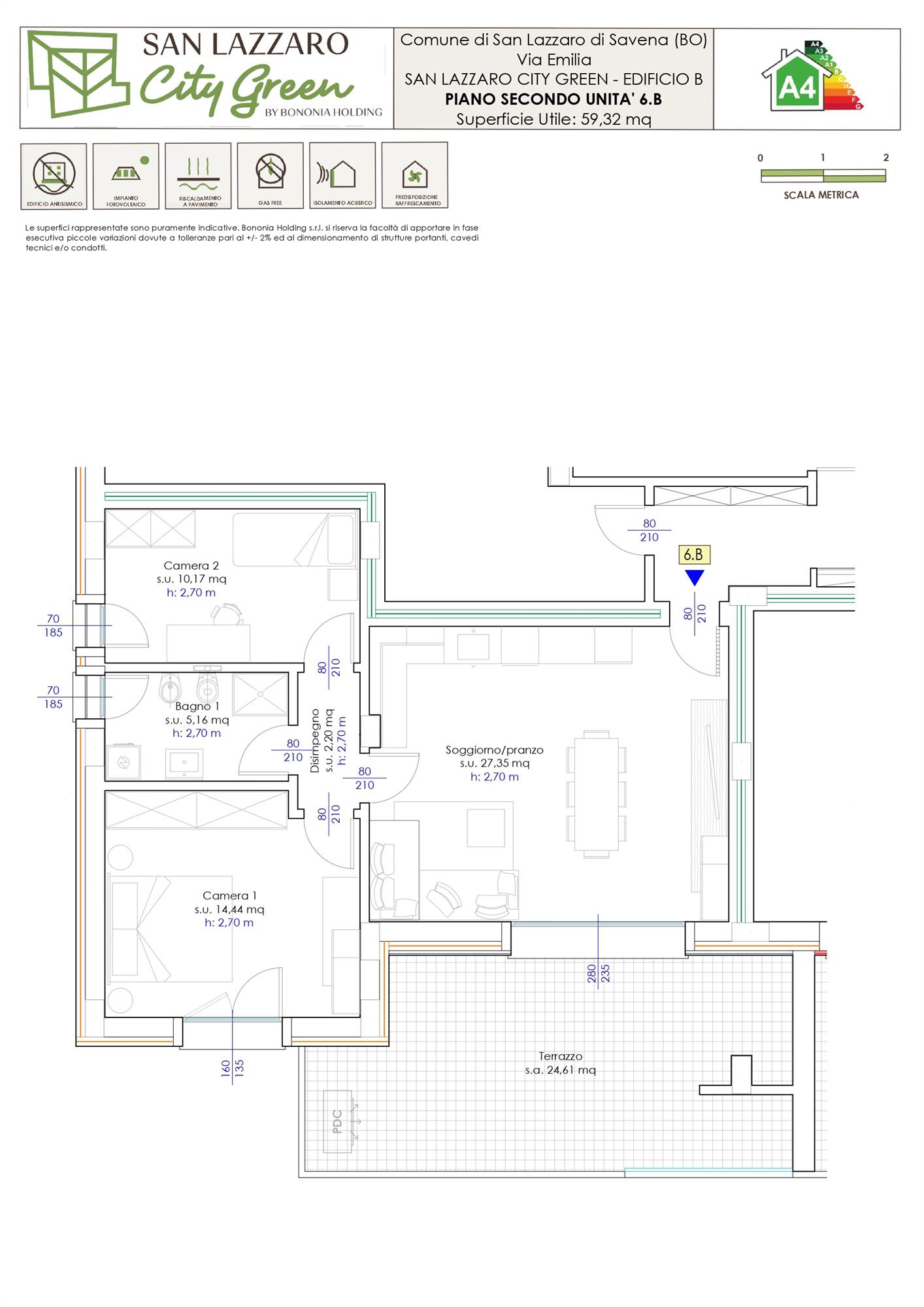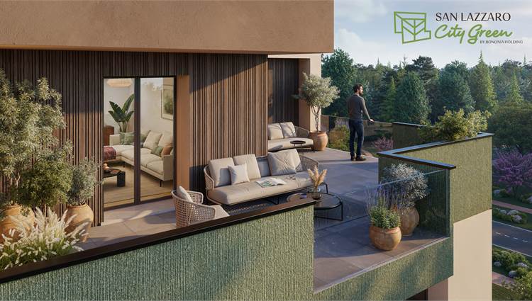 “San Lazzaro City Green” sarà costituito da 8 piccole palazzine, realizzate in classe energetica dalla A2 alla A4, ogni unità sarà autonoma nei consumi impianto fotovoltaico privato a beneficio esclusivo dell’immobile, predisposizione impianto aria condizionata, riscaldamento a pavimento, tapparelle motorizzate, cappotto esterno, ampie terrazze utilizzabili come zone living in aggiunta al salotto.