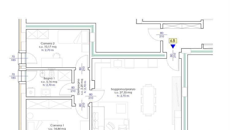 L'appartamento ha esposizione sud ovest, composto da salotto con angolo cottura di 27 mq calpestabili con accesso alla terrazza abitabile di 24 mq interamente coperta un vero e proprio ampliamento della zona living, disimpegno, 2 camere da letto, bagno e comoda cantina al piano. A parte autorimessa con possibilità di scelta, prezzi a partire da € 32.000. Possibilità di acquistare anche cantina ciclabile.