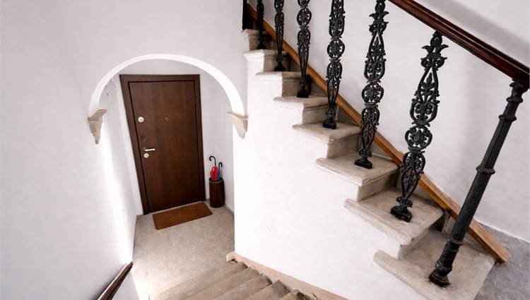 TRILOCALE PIANO PRIMO: Ampio ingresso di 13mq, soggiorno con cucina a vista con affresco originale al soffitto, 2 camere da letto, bagno, cantina di 14mq e locale deposito per e-bike.
