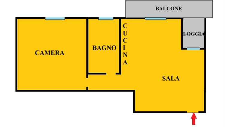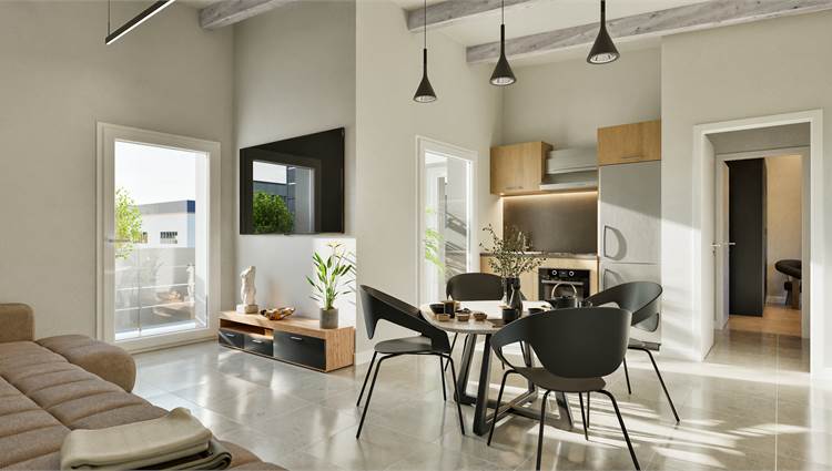 Unita A5 - piano Primo: Ampia sala con cucina a vista ( con accesso a loggia coperta e balcone di 7 mq) camera matrimoniale, bagno finestrato. Posto auto privato e Giardino di 35 mq completano la proprietà. Euro 207.000 - volendo garage. Posti auto condominiali per ospiti.