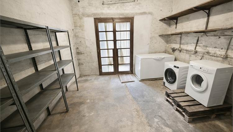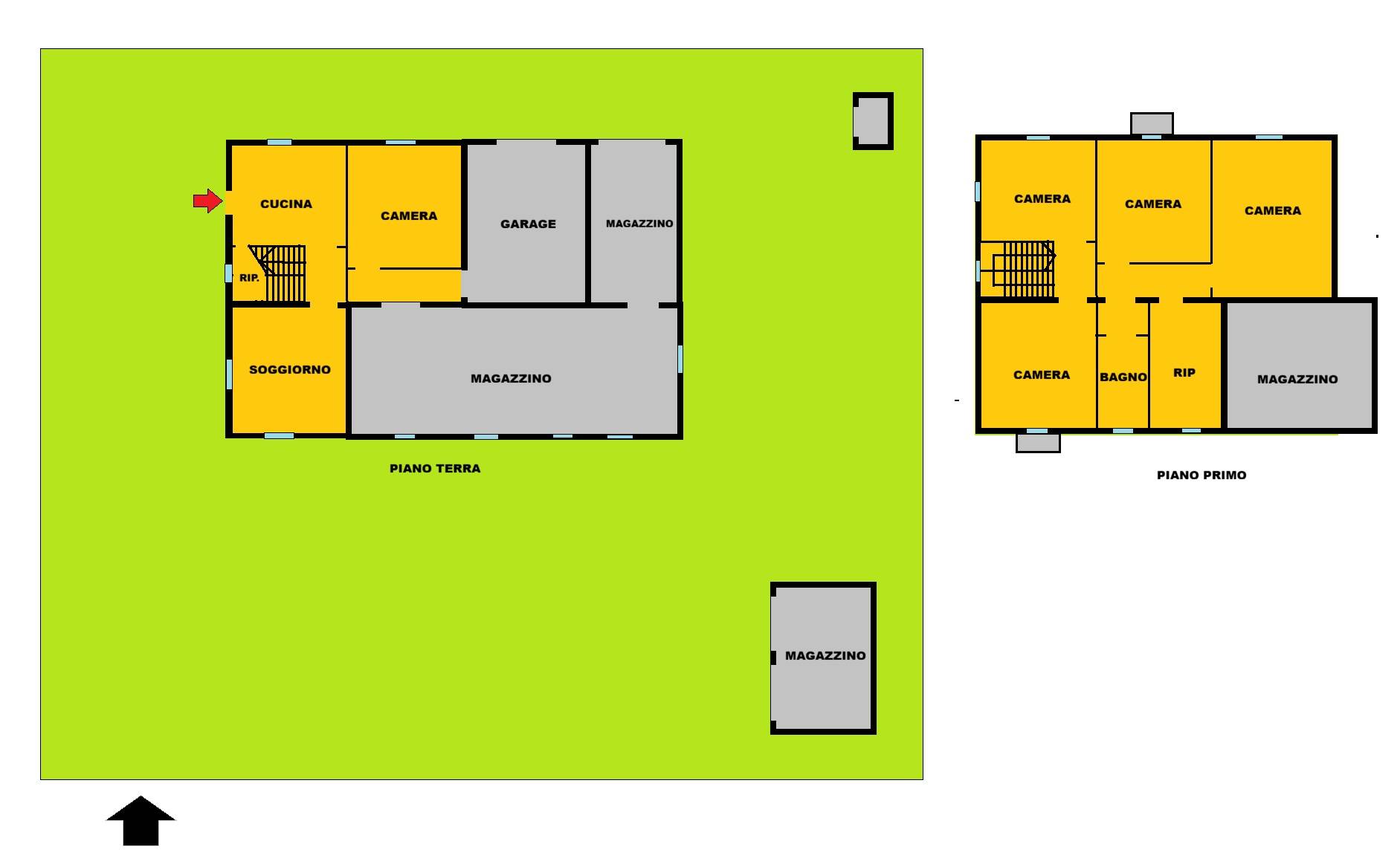Piano terra: Cucina abitabile con camino, soggiorno, camera, bagno, cantina, garage e magazzino.
