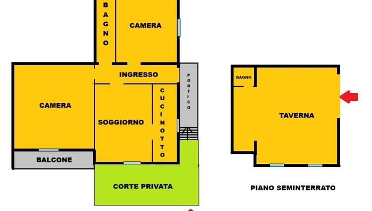 La soluzione comprende: ingresso, soggiorno, cucinotto separato, 2 camere matrimoniali, bagno finestrato, balcone, taverna di 34 mq, cantina e garage.