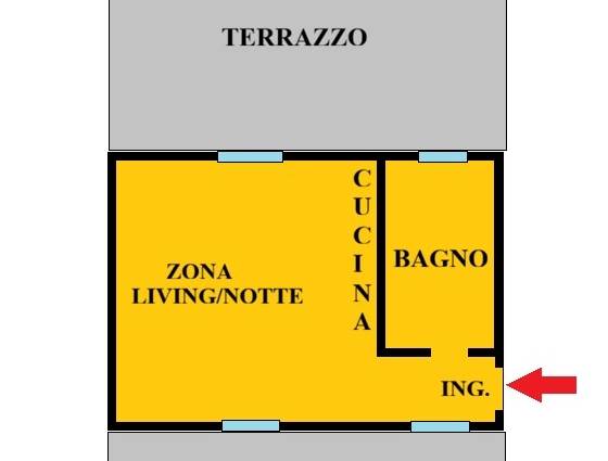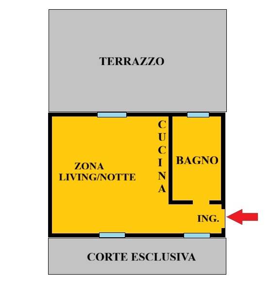 UNITA' 1: MONOLOCALE al piano terra con terrazzo di 40 mq, bagno finestrato, ulteriore corte esterna di 10 mq e cantina ciclabile. 3 affacci esterni e 4 finestre, donano grande luminosità all' appartamento.