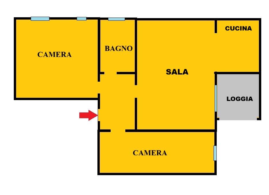 Appartamento sito al primo piano, composto da ingresso, sala con cucina a vista loggia coperta, 2 camere da letto, bagno finestrato e cantina ciclabile. 2 affacci esterni e 5 finestre, donano grande luminosità all' appartamento.