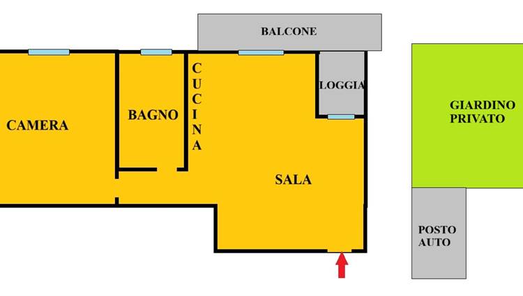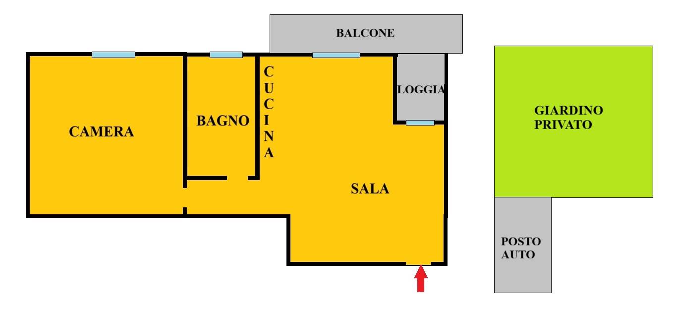 Ampia sala con cucina a vista ( con accesso a loggia coperta e balcone di 7 mq) camera matrimoniale, bagno finestrato. Posto auto privato e Giardino di 35 mq completano la proprietà.