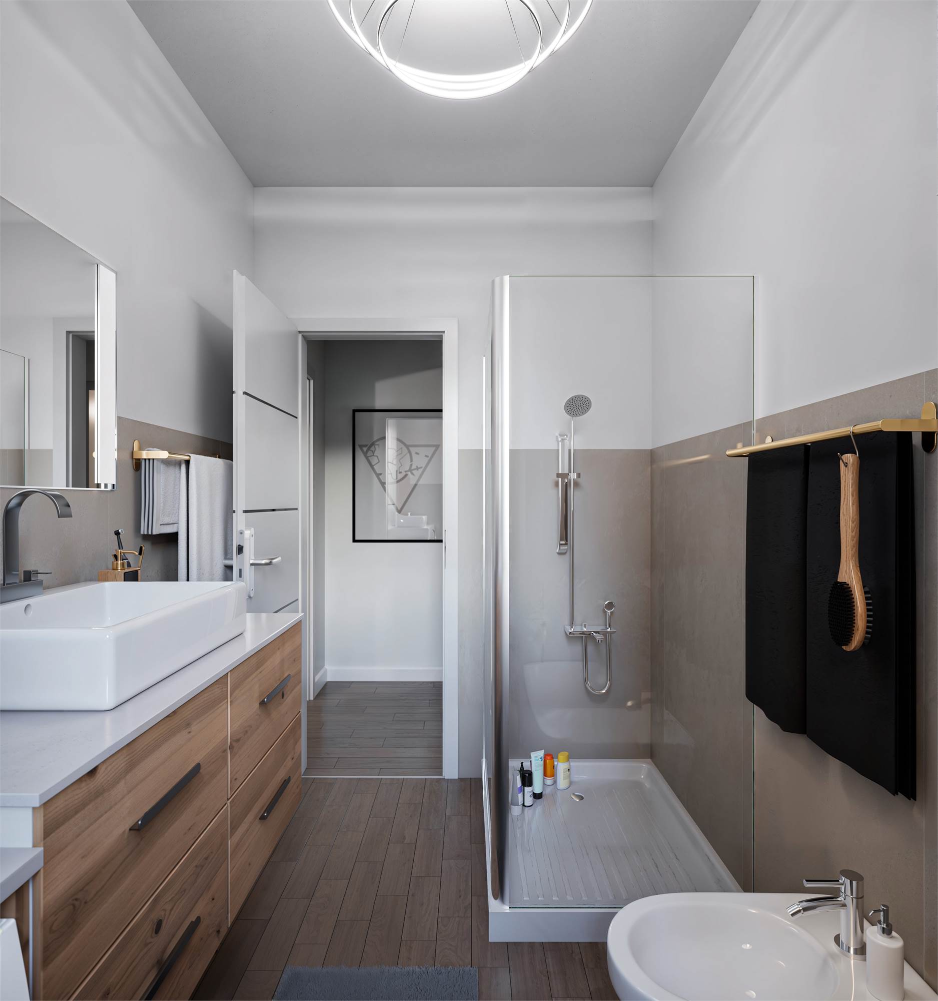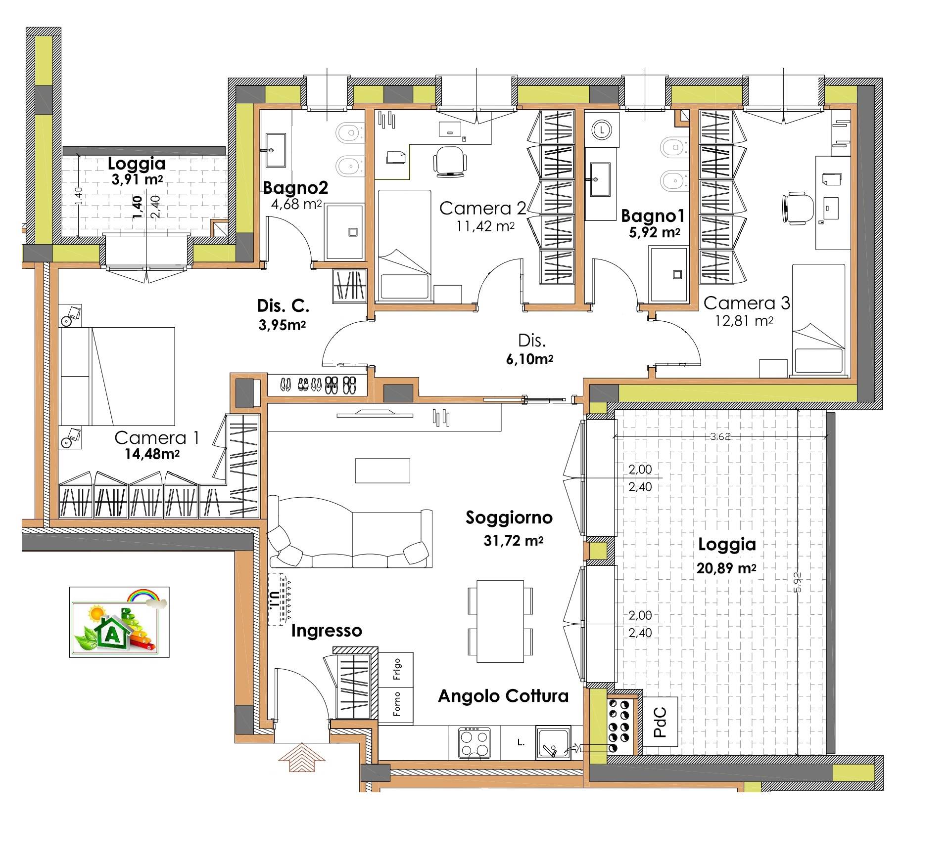 NO ONERI DI MEDIAZIONE A CARICO ACQUIRENTE. Classe energetica A o superiore, parapetti terrazze in muratura per maggiore privacy, pannelli fotovoltaici, impianti riscaldamento autonomi con pompa di calore aria acqua per gestire riscaldamento acqua calda e fredda, tapparelle motorizzate in alluminio con cassonetto ad incasso nella muratura, predisposizione impianto raffrescamento idronico funzionante con la pompa di calore installata, predisposizione impianto allarme perimetrale, pavimentazione in gres porcellanato formati fino a 60x60 cm effetto legno 20x120 cm, sanitari posati filo muro/pavimento.